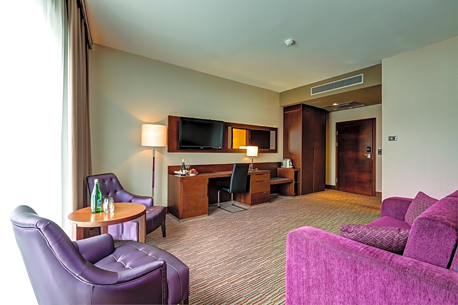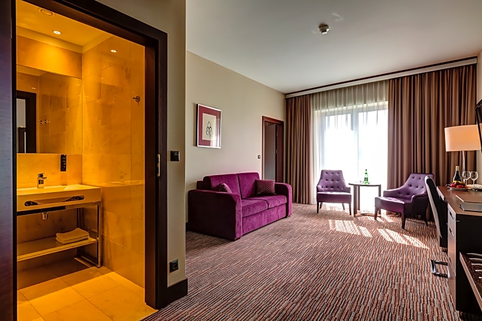 An air-conditioned room with high-class furniture and a bathroom featuring marble elements. It has flat-screen TV, a safe and a mini-bar.